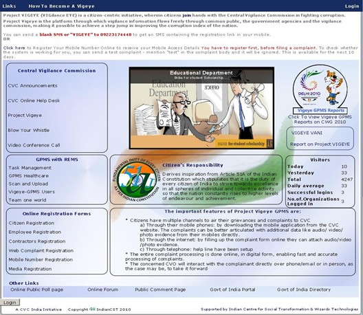Vigeye GPMS was developed along with Central Vigilance Commission using advanced information & communication technologieswith remote eye monitoring system.It is integrated into GPMS for capturing data from the field, such as photographs, audio/video, comments and signatures of witnesses, etc. through mobile phones/ devises. The GPS location where the photo is taken, is automatically recorded and uploaded to GPMS for improving Vigilance and Public Works Monitoring with the active involvement of concerned citizens , the solution is being used by 2700 across central government organizations and depatrments.